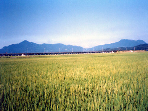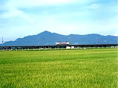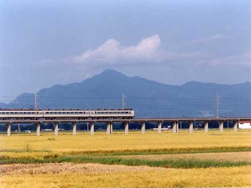 新潟県の南の端で、霊峰米山が一番美しく見えて田んぼの真ん中を「ほくほく線」が走ってます。その陸橋前で撮影しました。NHK大河ドラマ「天地人」の舞台となりました春日山城はすぐ近くです。白鳥が飛来する湖沼がたくさんある自然に恵まれた所です。