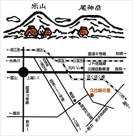 上越新幹線越後湯沢駅・上越線六日町駅と信越線犀潟駅を通る「ほくほく線・くびき駅」下車、車で5分