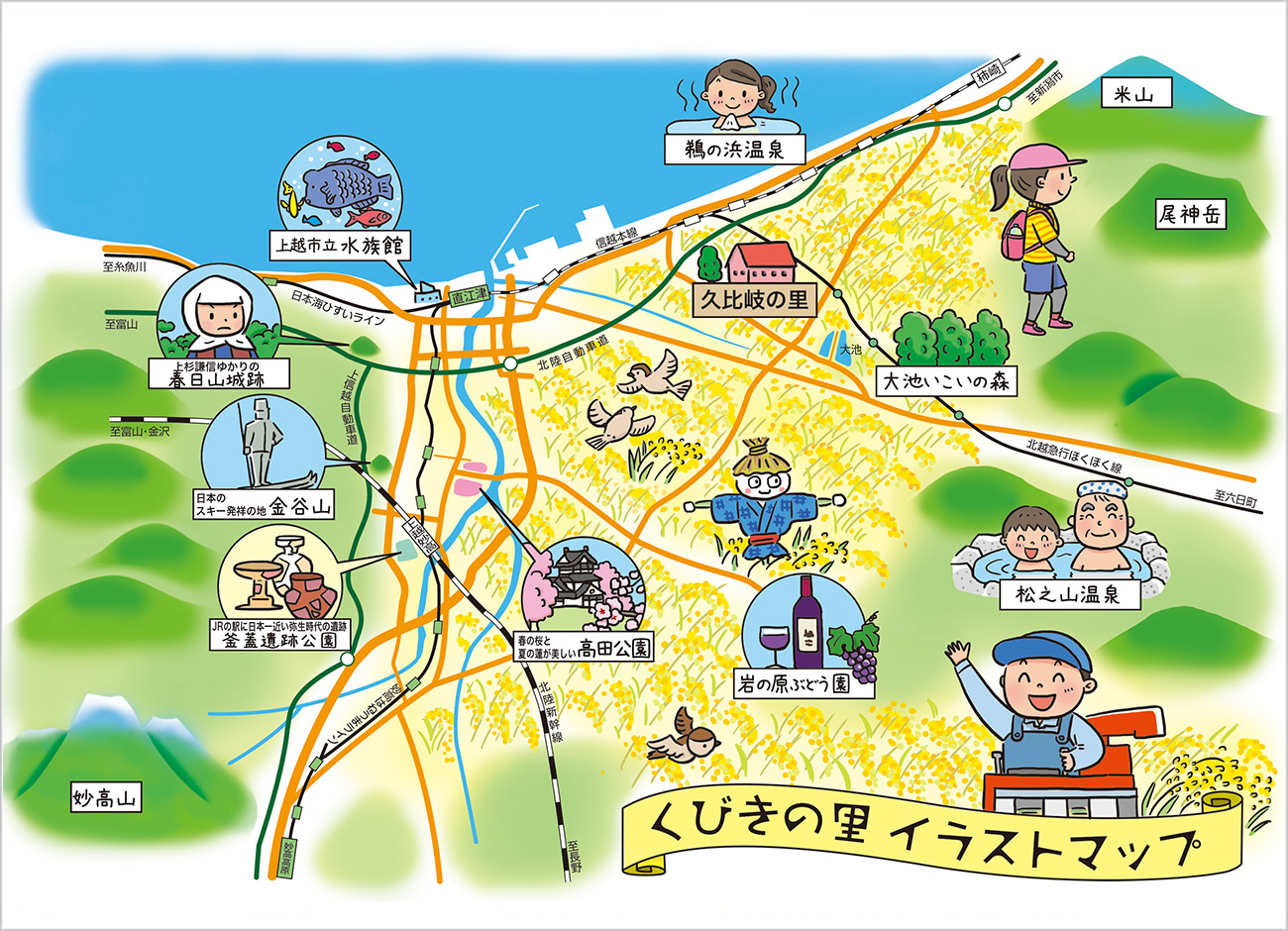 一方を日本海、三方を米山や妙高など越後の山々に囲まれた田園の中にあります。四季折々に変わる米山や尾神岳と「ほくほく線」。そして雄大な妙高連山。日本海はすぐ近く、海の幸、山の幸、里の幸、この豊かな大自然に恵まれています。