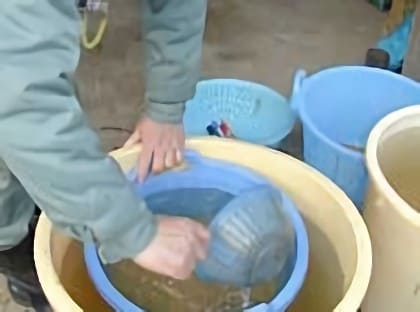 - 二度目はたっぷりの水を入れ、にごり水を捨てる。